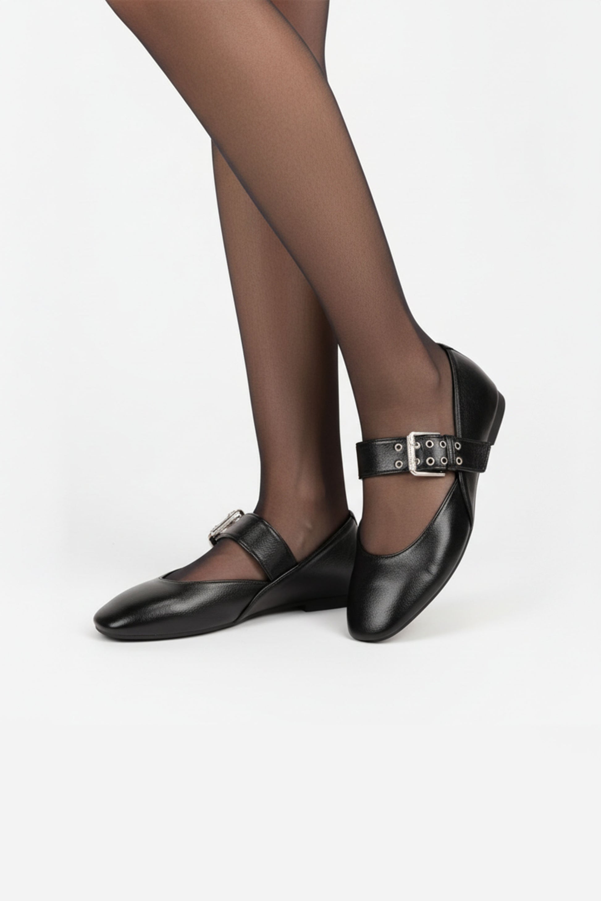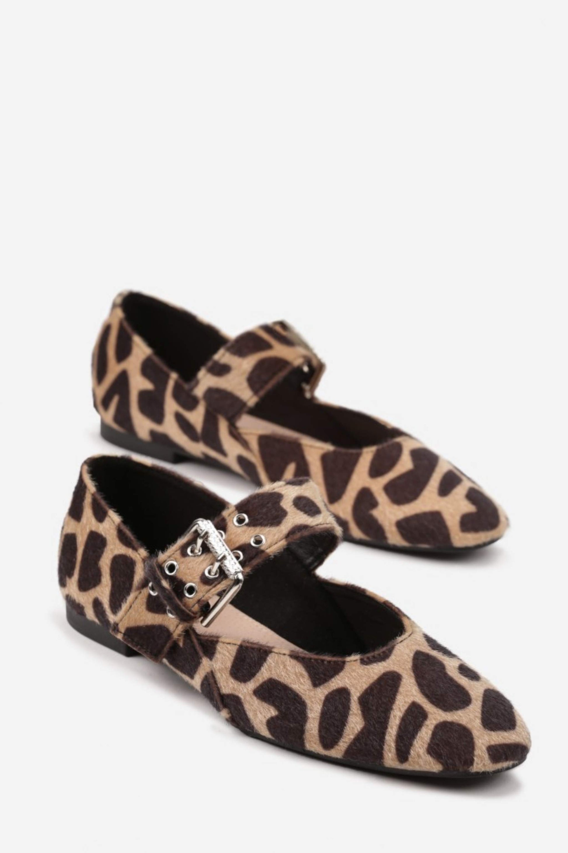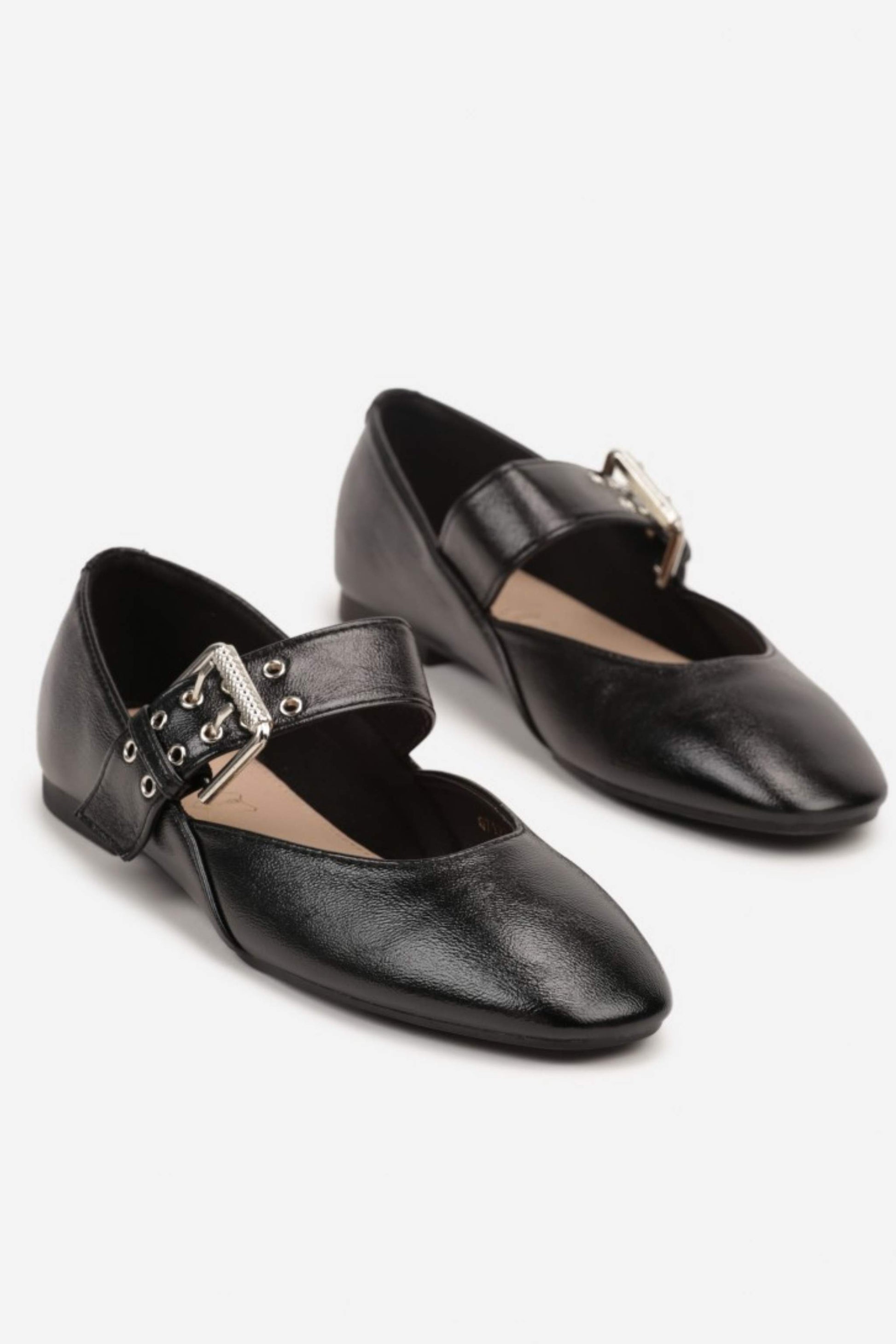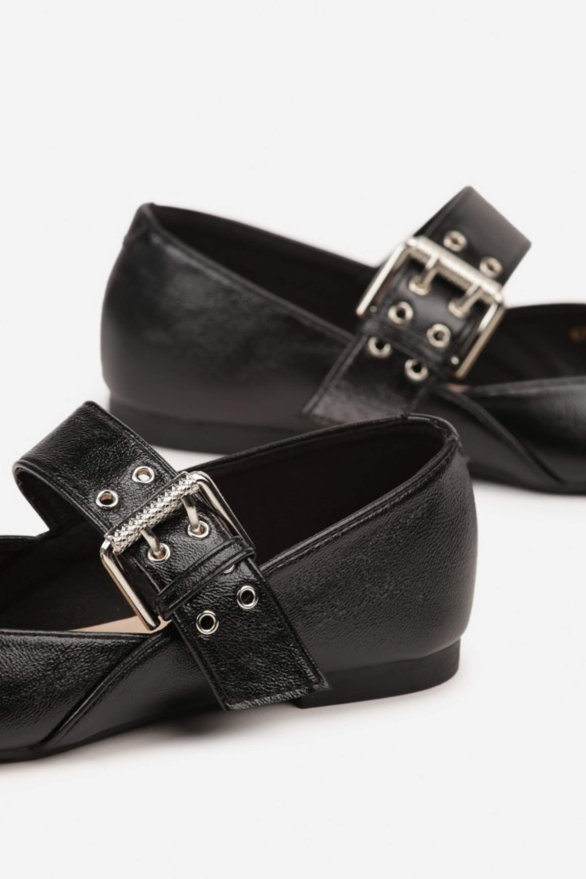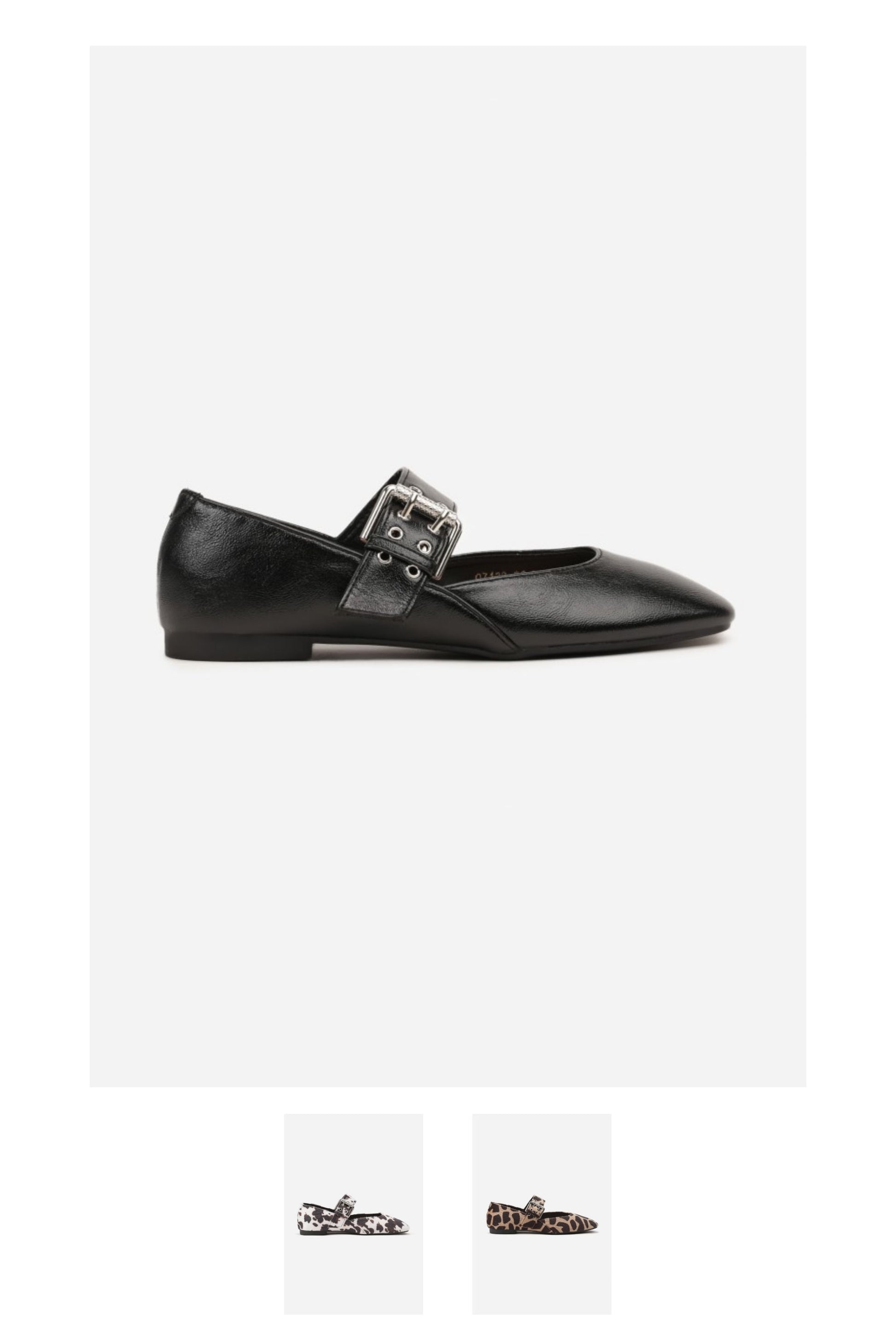 Širší pásek s kovovou přezkou a očky bezpečně drží nárt a funguje jako šperkový detail. Mandlová špička opticky zeštíhlí chodidlo, nízký podpatek / podešev zůstává pohodlný na běžné chození. Skvělé k džínám a bílému tričku, ale i k malým černým šatům nebo kostýmu – boty udělají show za vás.