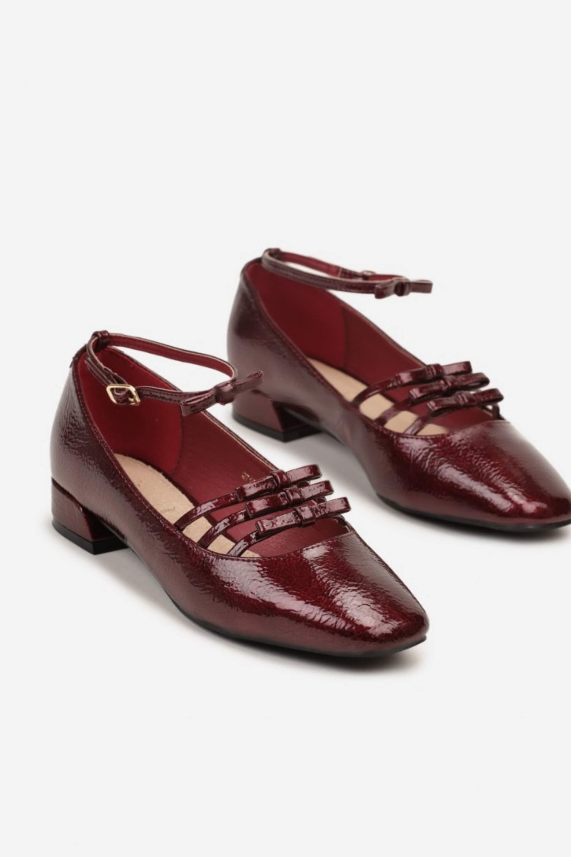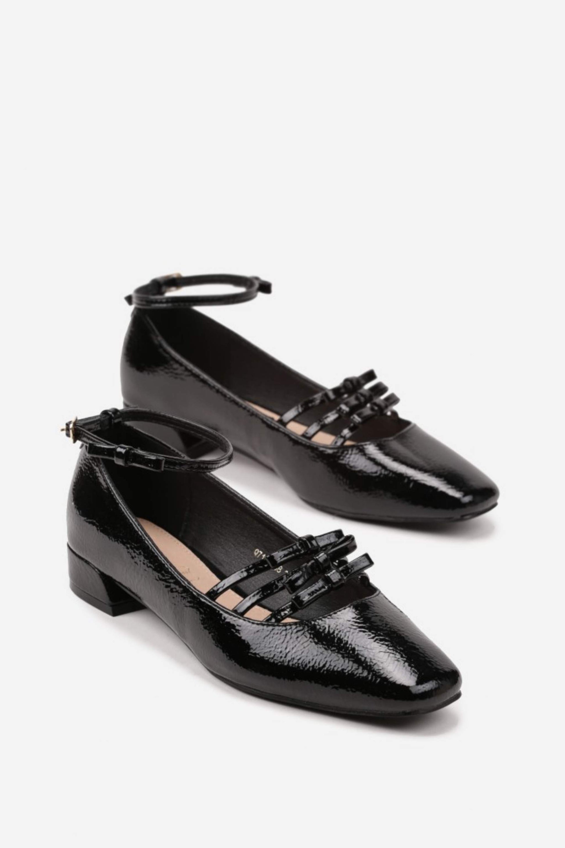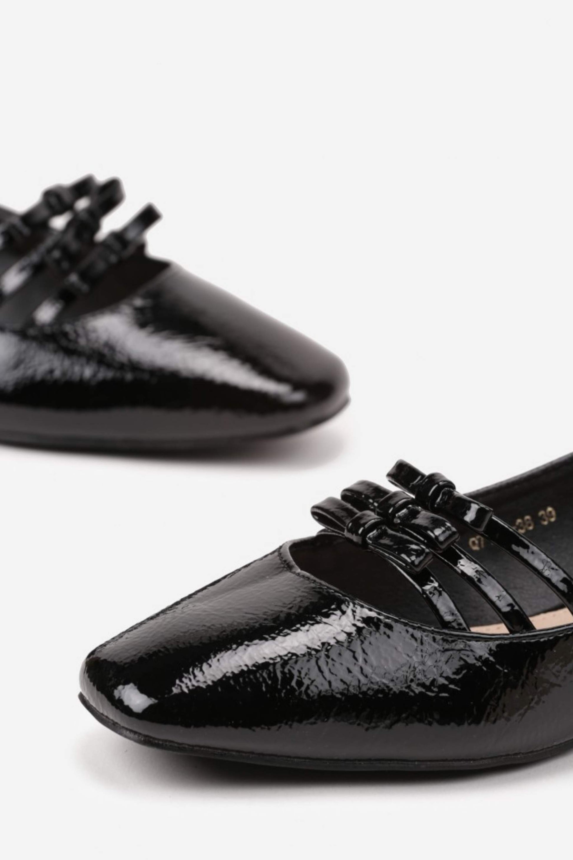 Model Trinity přináší moderní pojetí klasických Mary Jane. Tři tenké pásky na nártu vytvářejí šperkový efekt a současně drží nohu jistě na místě. Lakovaný svršek s vysokým leskem působí chic, jemně do špičky tvarovaná špičkaopticky prodlouží nohy a nízký podpatek zůstává pohodlný na celodenní nošení. Skvělé do práce i na večer – stačí přidat sako nebo saténovou sukni.