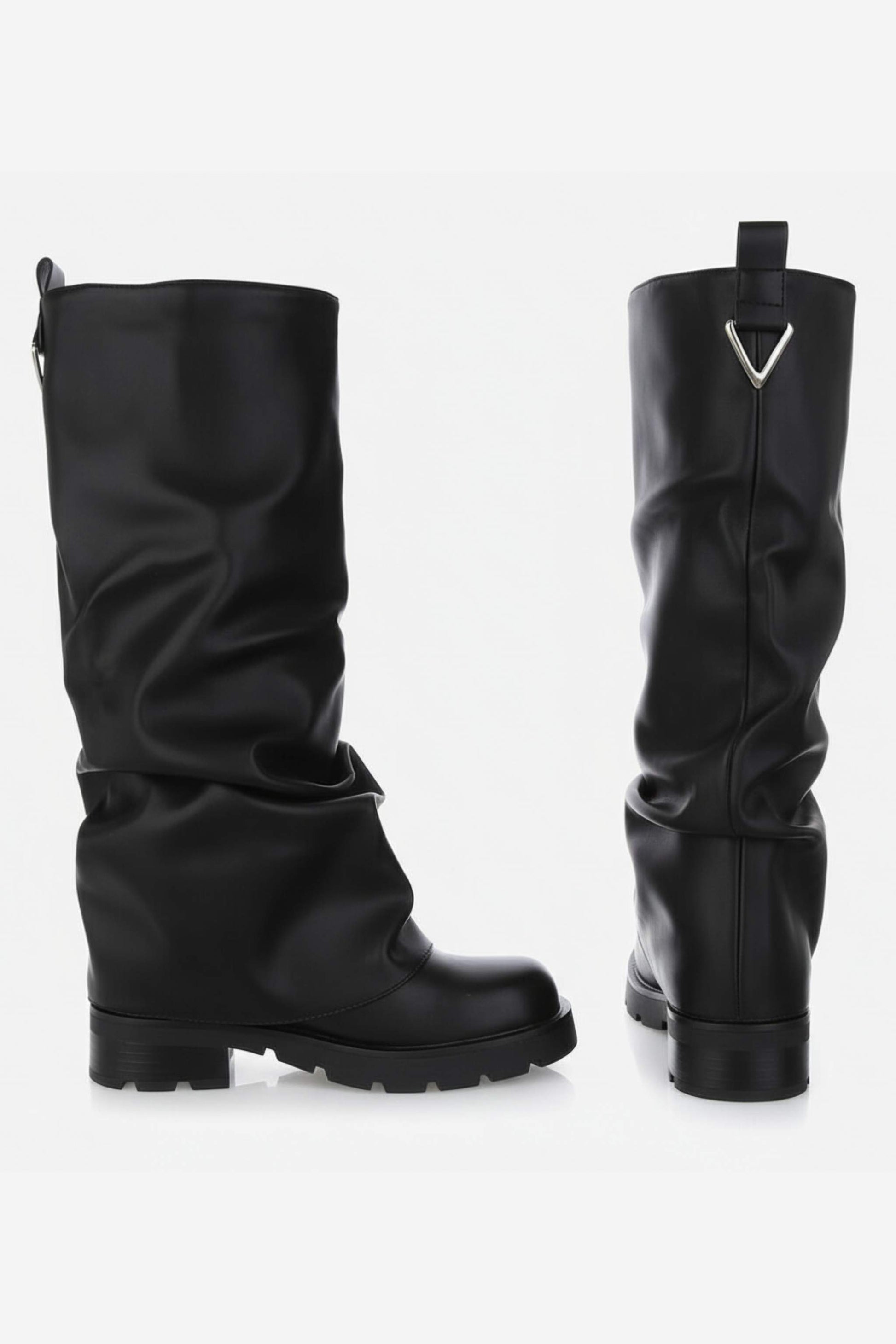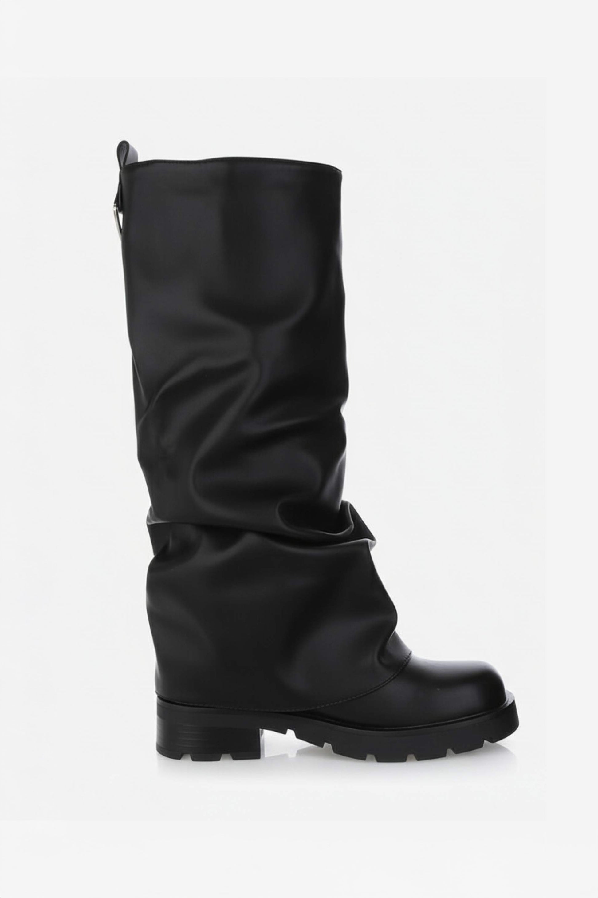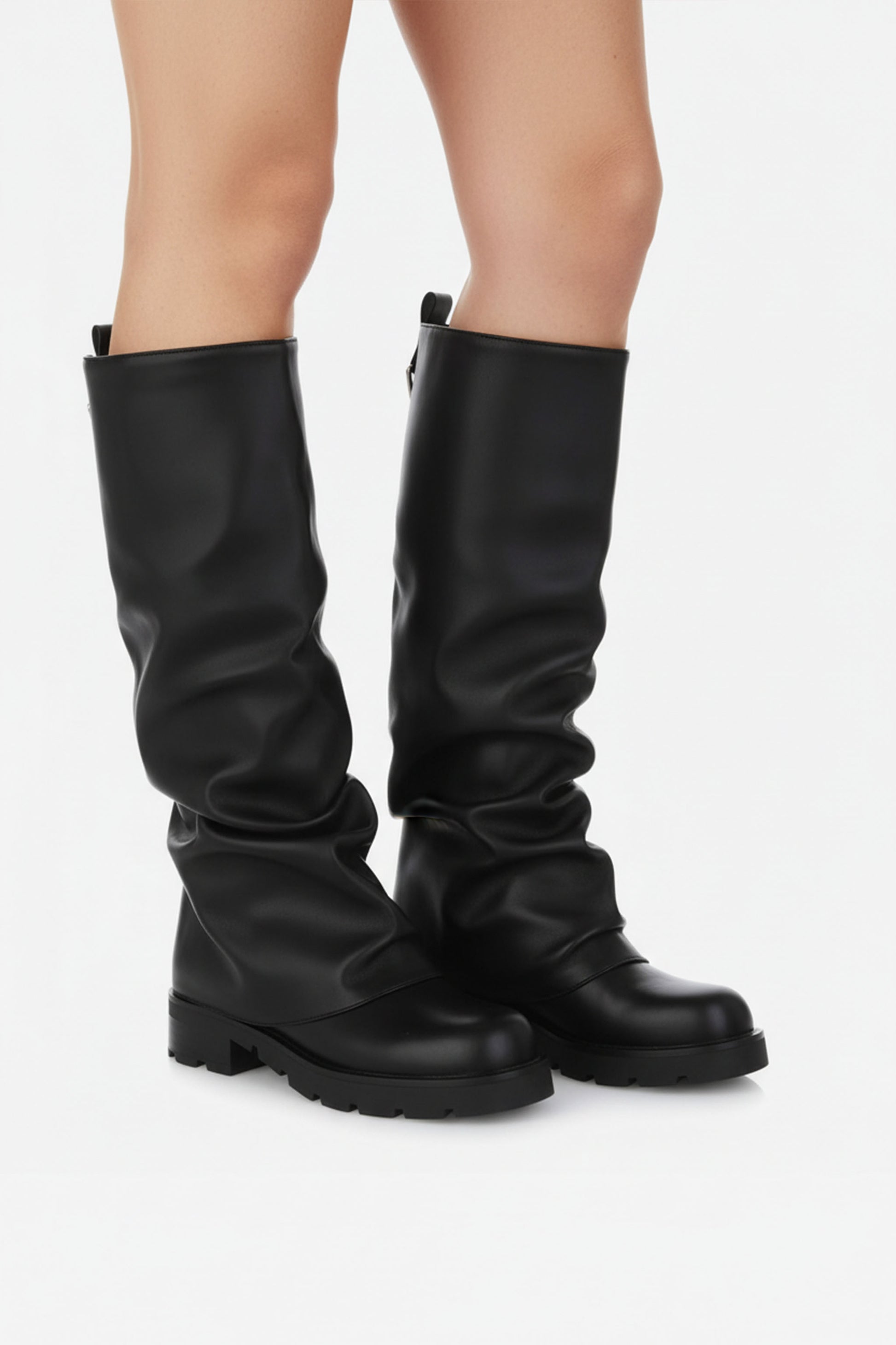 Kozačky Storm spojují uvolněnou slouchy siluetu s robustním městským stylem. Nabrání na holeni působí ležérně a opticky zeštíhlí nohu, traktorová podešev s nízkým podpatkem přidá jistotu kroku i pár centimetrů navíc. Kulatá/almond špička udrží look nadčasový a pohodlný. Černý hladký svršek se snadno udržuje a vypadá výborně s pletenými šaty, kabátem i širokými džínami. Ideální volba na podzim a zimu, když chceš komfort i razantní vzhled.