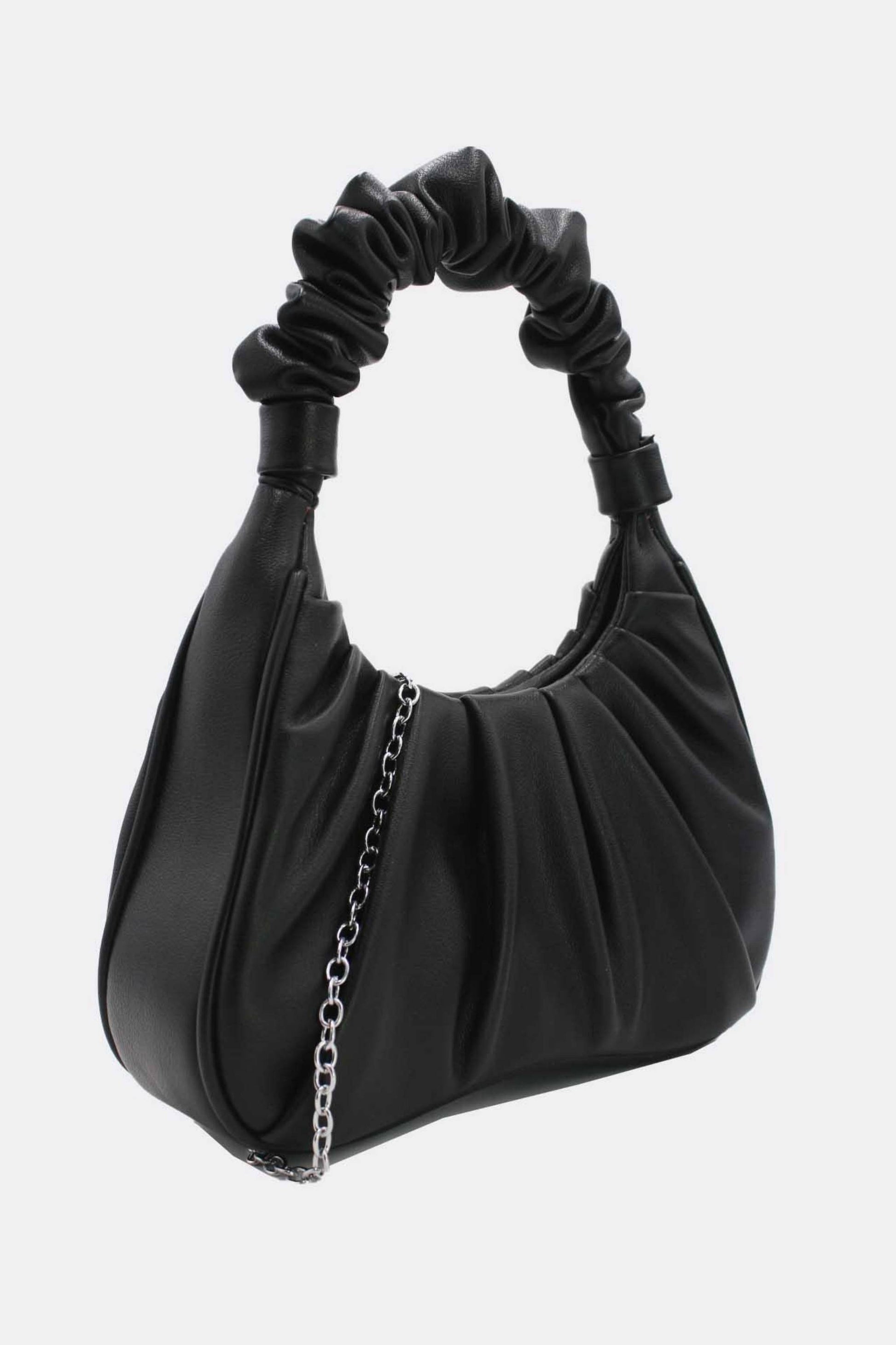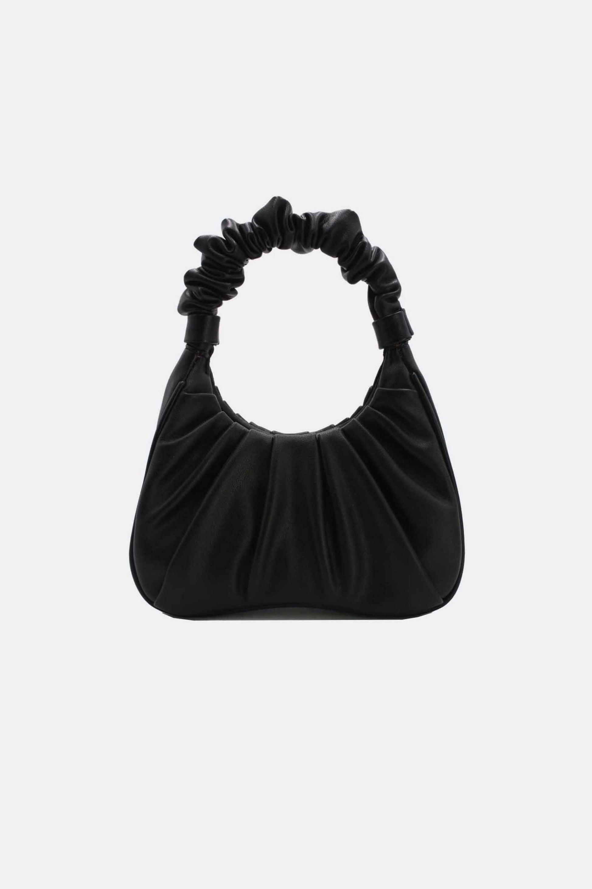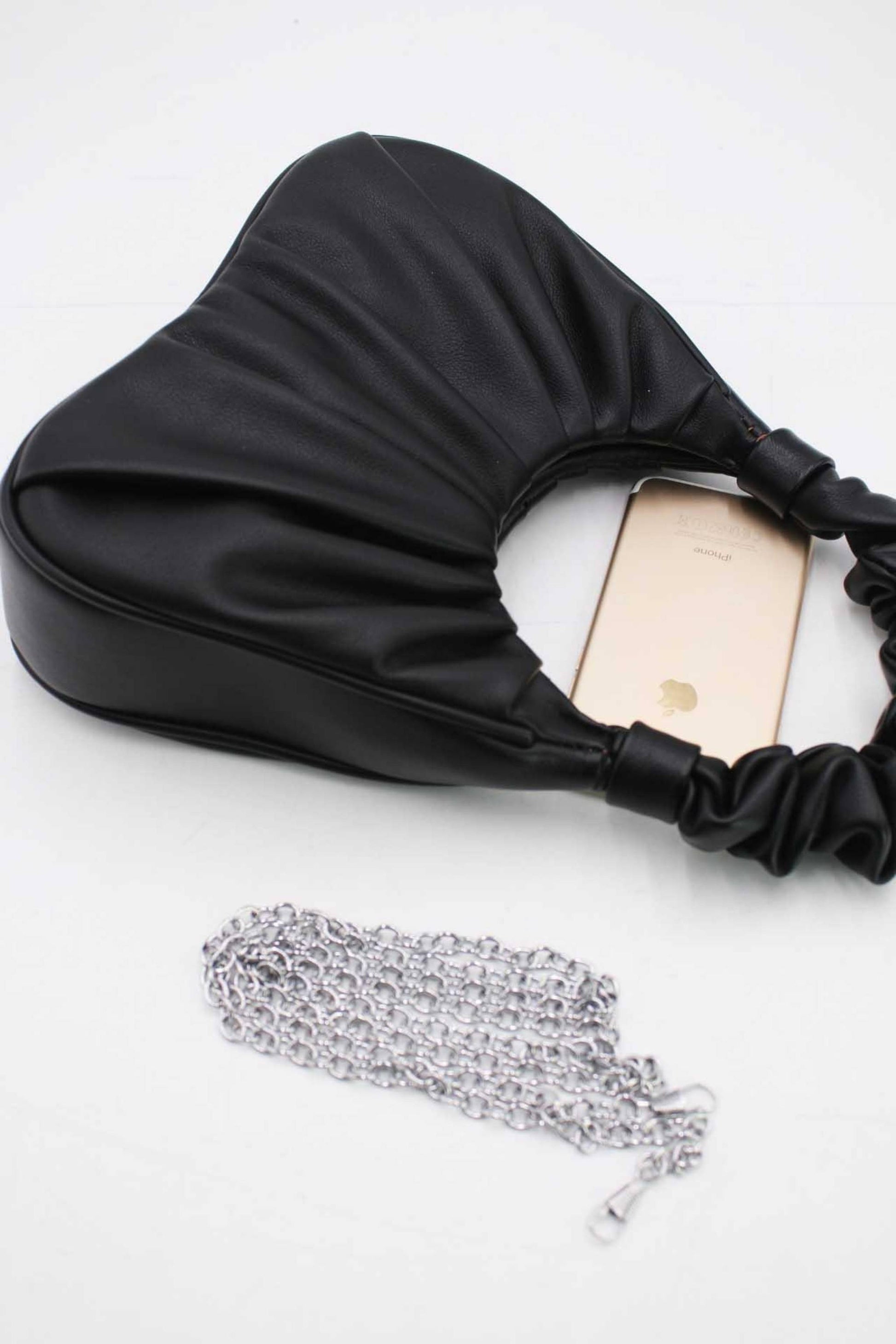 Model Halo je efektní a praktický zároveň. Kruhové scrunchie ucho se pohodlně nosí v ruce i na předloktí a vytváří výraznou „šperkovou“ linii. Měkký, bohatě řasený materiál drží moderní tvar, zatímco zapínání na zip jistí všechny nezbytnosti. Kdykoli potřebuješ volné ruce, připneš dlouhý řetízkový popruh a máš crossbody. Uvnitř je prostor na telefon, peněženku, klíče a pár beauty drobností – ideální na večeři, do města i na party.