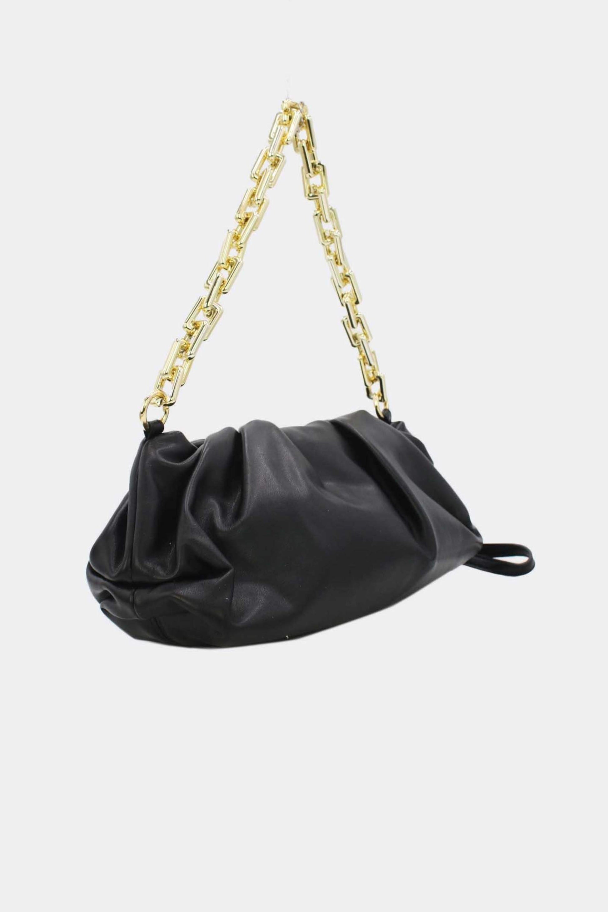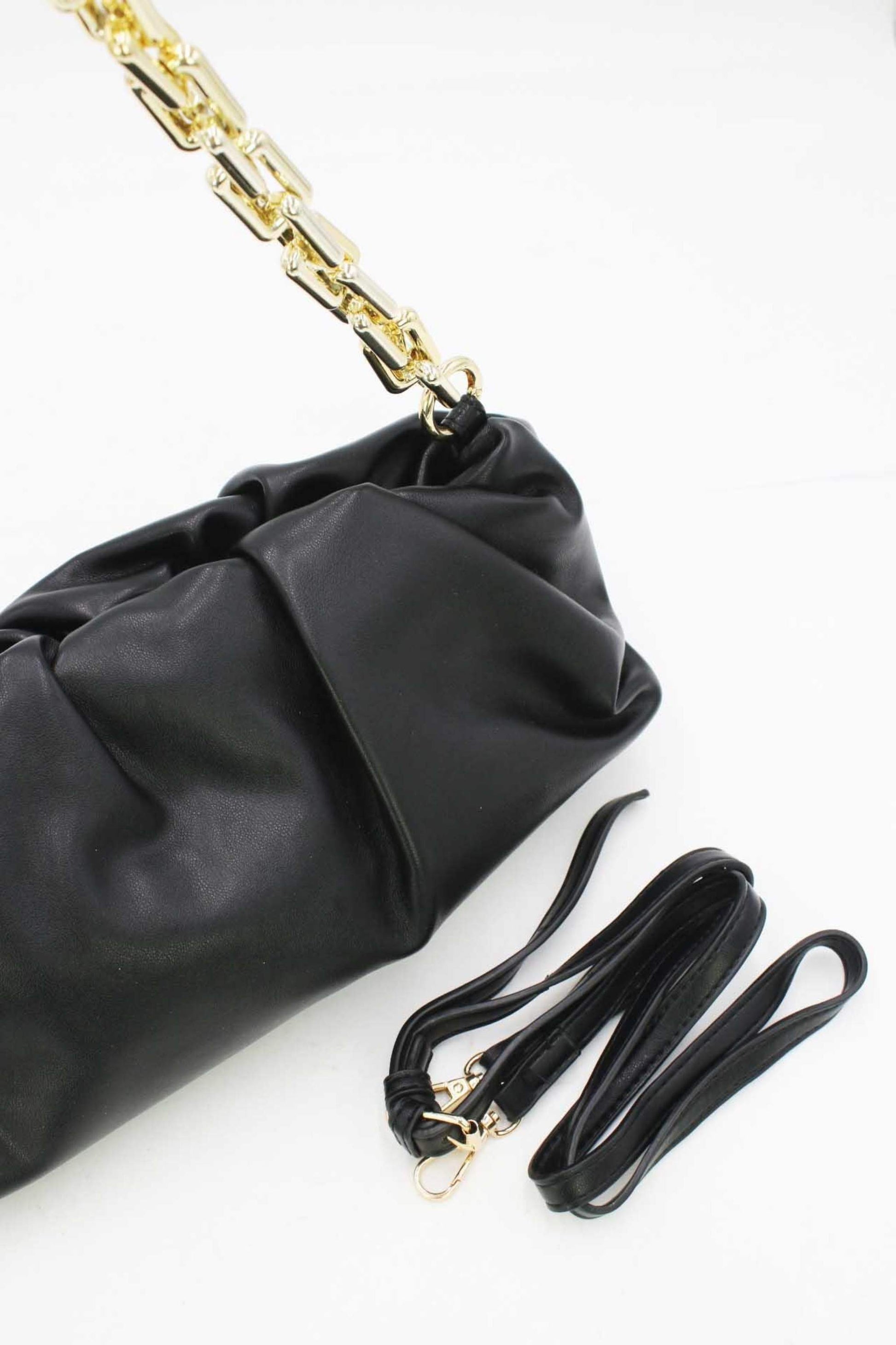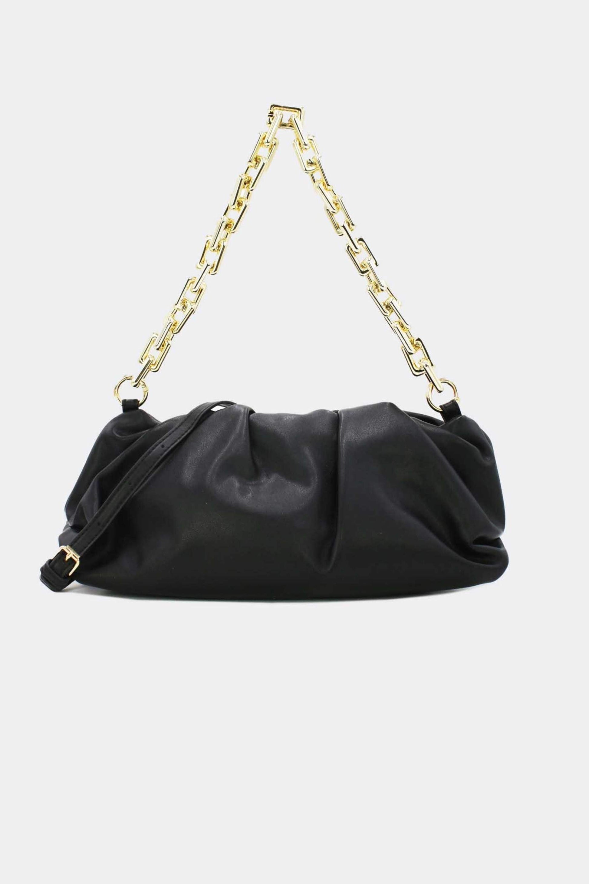 Model Noir Chain spojuje sošnou „cloud“ siluetu s glam kovovým akcentem. Měkký vršek se elegantně řasí, masivní řetěz funguje jako šperk i praktické ucho do ruky. Kdykoli potřebuješ volné ruce, připneš dlouhý popruh a máš z ní pohodlné crossbody. Hlavní komora je podšitá a chrání všechny nezbytnosti – od telefonu a peněženky po rtěnku a mini parfém. Minimalistická černá se zlatým hardwarem povýší denní i večerní outfit.